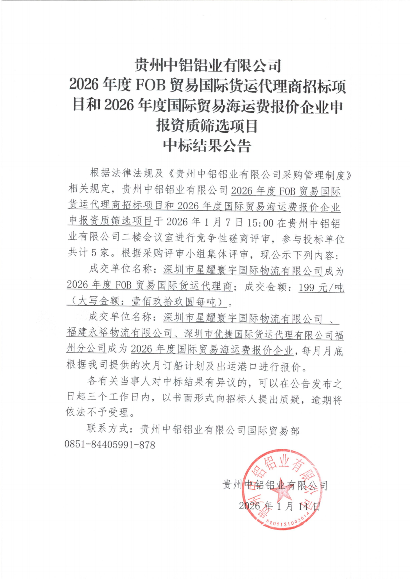 貴州中鋁鋁業(yè)有限公司 2026年度FOB貿(mào)易國際貨運代理商招標(biāo)項目和2026年度國際貿(mào)易海運費報價企業(yè)申報資質(zhì)篩選項目中標(biāo)結(jié)果公告