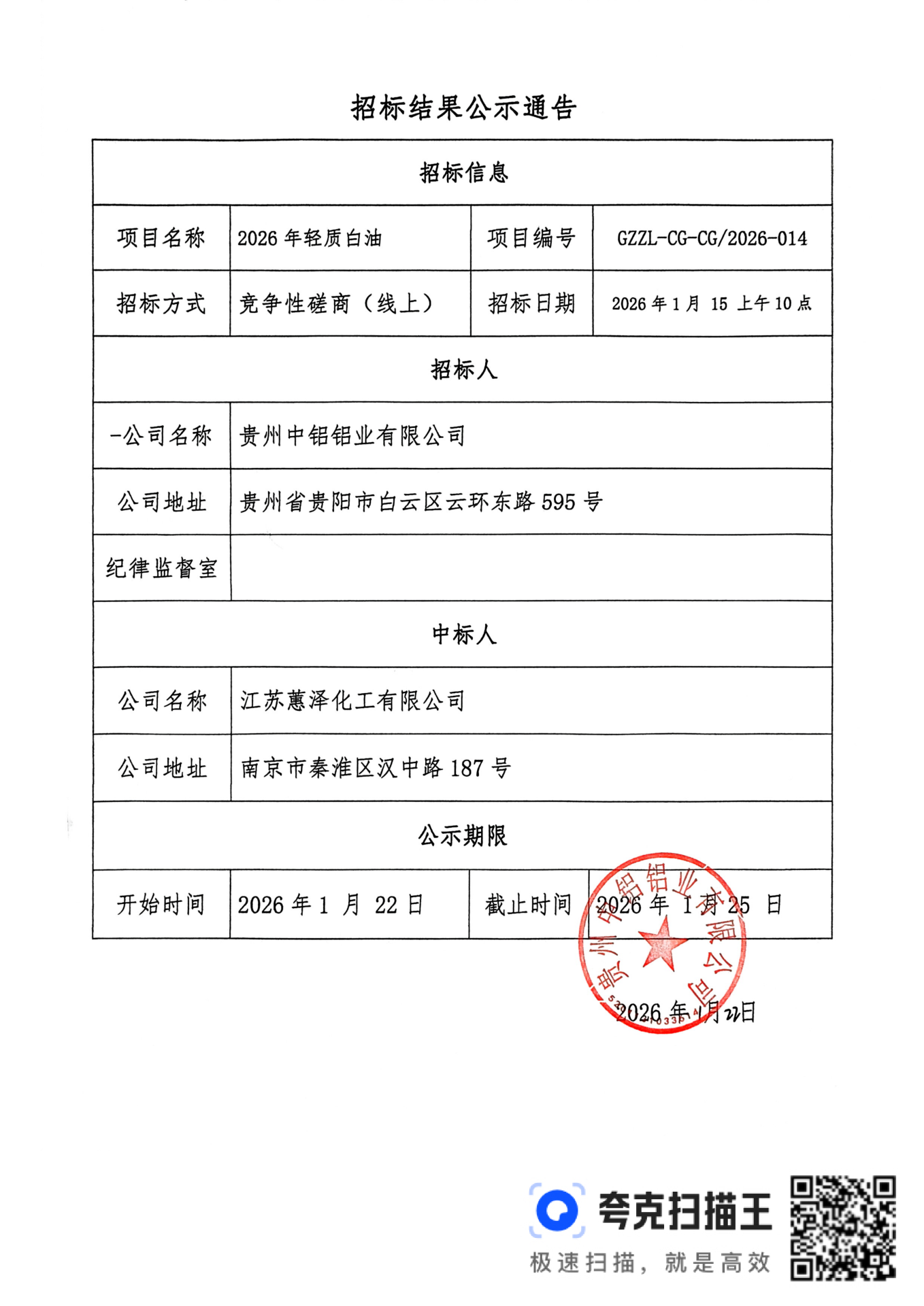 輕質白油招標結果公示通告